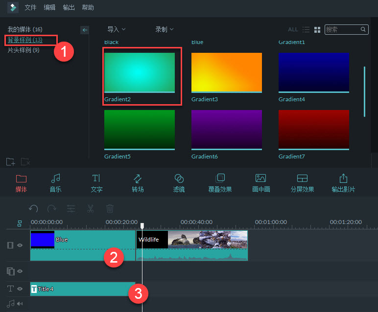 3、進(jìn)入媒體庫,選擇背景色模板,將所選的背景色添加到時間軸的開頭或指定位置。進(jìn)入文字選項,添加文字模板并應(yīng)用,調(diào)整背景色及文字的持續(xù)播放時間