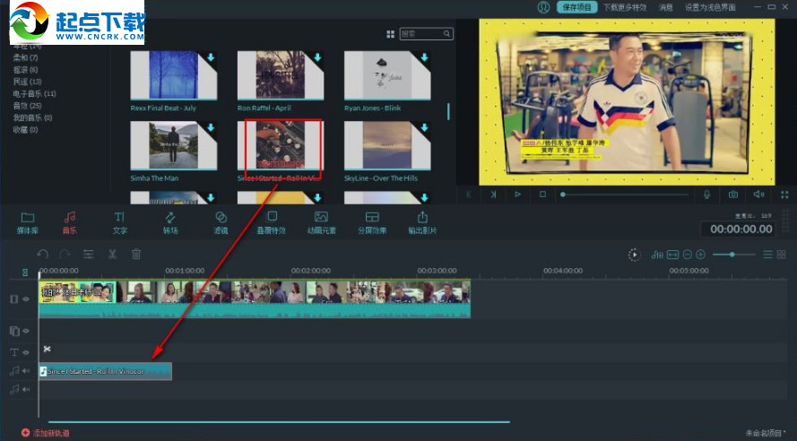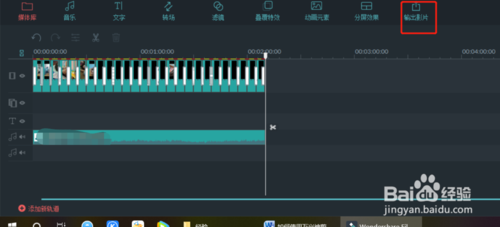 9、若用戶需要將本地音樂作為背景音樂,可以直接在媒體庫中導(dǎo)入音樂文件,然后拖動文件到音軌時間軸上,設(shè)置完成后我們進(jìn)行導(dǎo)出即可。