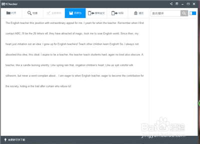 都知道英語寫作在考試比分中占了很大部分,易改英語寫作軟件是全球最領(lǐng)先的英語寫作校對軟件,提供寫作錯(cuò)誤解釋、整句翻譯、雙詞對比等輔助查詢,大大提高我們的英語寫作水平。錯(cuò)誤歷史統(tǒng)計(jì)和錯(cuò)誤詞匯統(tǒng)計(jì)您可以在“用戶中心”欄目內(nèi)的“糾錯(cuò)歷史”中查看您的錯(cuò)誤統(tǒng)計(jì)和詞匯統(tǒng)計(jì)。易改會為您記錄糾錯(cuò)歷史和詞匯水平,以方便您更有針對性地提高英語水平。