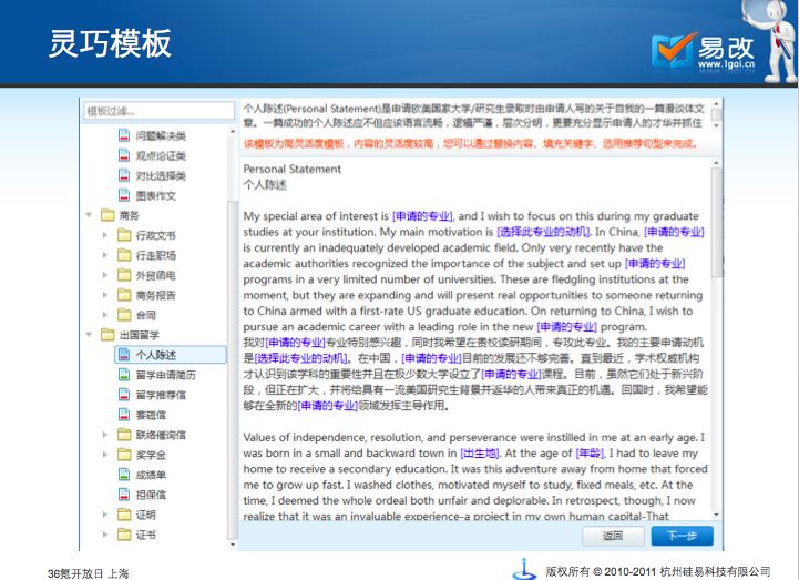 "易改"是由杭州硅易科技有限公司自主研發(fā)的一款基于云計(jì)算的免費(fèi)英語寫作輔助軟件。通過易改的幫助,您可以便捷高效地進(jìn)行英語文本拼寫校對、語法糾錯(cuò)和風(fēng)格潤色,更有錯(cuò)誤解釋和詞典等功能來協(xié)助您更快速改正錯(cuò)誤、提高寫作質(zhì)量。目前該軟件處于公測階段,歡迎大家體驗(yàn)。