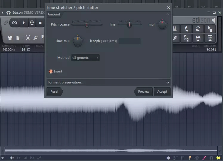 然后搜索插件,找到 Edison 插件,在新通道中打開,圖示即為變速變調(diào)處理按鈕。加載一個采樣作為示例。
