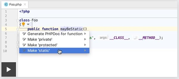 如果一個類有一個不使用任何實例引用的方法,PhpStorm將檢測它并提供一個方便的快速修復(fù):按下 Alt+Enter該方法,并使其靜態(tài)。所有用法都將自動更新。