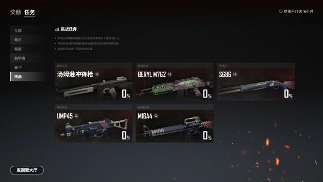 共有5種與槍械(Tommy Gun, BerylM762, S686, UMP45, M16A4)相關(guān)聯(lián)的任務(wù),完成該任務(wù)后可以獲得與各槍械相對應(yīng)的皮膚。
