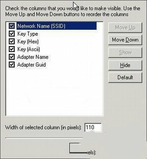 在“View”菜單中選擇“Choose Columns”,在彈出的窗口中定制顯示方式,比如僅僅顯示無線網(wǎng)絡(luò)名稱和無線密碼,選擇“Network Name(SSID)”和“ Key(Ascii)”這兩個(gè)選項(xiàng)就可以了。