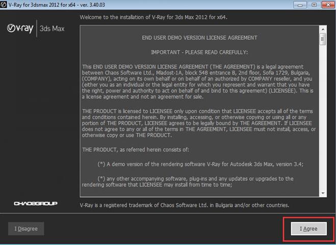 安裝步驟1、打開已下載好的vray渲染器軟件包,找到它的執(zhí)行文件運行就好啦。雙擊打開后會出現(xiàn)如下界面,點擊“I Agreee"同意軟件安裝與使用協(xié)議: