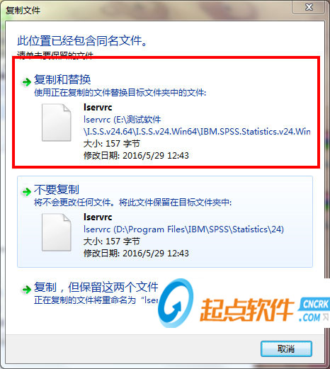 第二種:將安裝包“crack”目錄下的許可文件“l(fā)servrc”復(fù)制到安裝目錄下覆蓋源文件即可,默認(rèn)安裝目錄為C:\Program Files\IBM\SPSS\Statistics\24\