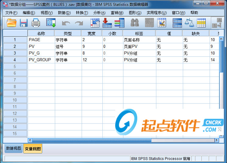 4、點擊變量視圖,即可出現(xiàn)如下界面。我們可以看到變量視圖中,第一個變量可以設(shè)置的包括名稱、類型、寬度、小數(shù)、標(biāo)簽、和值等設(shè)置類型。