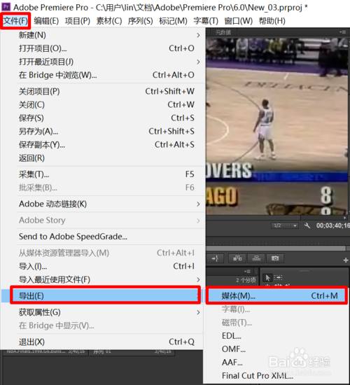 9、最后導(dǎo)出視頻,點(diǎn)擊【文件】,之后點(diǎn)擊【導(dǎo)出】,最后點(diǎn)擊【媒體】