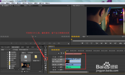 5、放置好素材文件后,可使用左旁的工具編輯素材。如刀片工具,可以用來截取自己想留下的素材部分,按DEL鍵刪除不需要的素材。