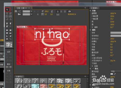 4、先選擇你需要的字體,再在字幕制作工具框里,選到用來輸入文字的 T 工具。(其中,有兩個 T 工具,一個是橫向輸入,一個豎向輸入,請自己選擇你需要的)然后,輸入好你需要的字幕后,你可以通過上方工具欄調(diào)整字體參數(shù),改變文字大小,顏色;或點擊箭頭工具,移動字體位置。(還有其他功能,可以多嘗試一下)