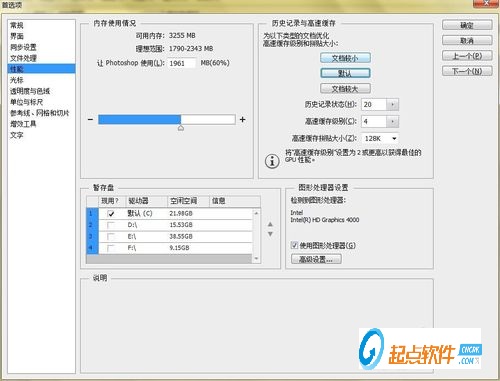 5.切換到【性能】選項(xiàng)卡,在【內(nèi)存使用情況】選項(xiàng)組中可以設(shè)置內(nèi)存的使用比例,例如設(shè)置為60%,在【歷史記錄與高速緩存】選項(xiàng)組中可以根據(jù)不同文檔類型的大小設(shè)置【歷史記錄狀態(tài)】和【高速緩存級(jí)別】。在【暫存盤(pán)】選項(xiàng)組中可以設(shè)置文件暫存的位置,默認(rèn)情況為C盤(pán),設(shè)置完畢后單擊【確定】按鈕。