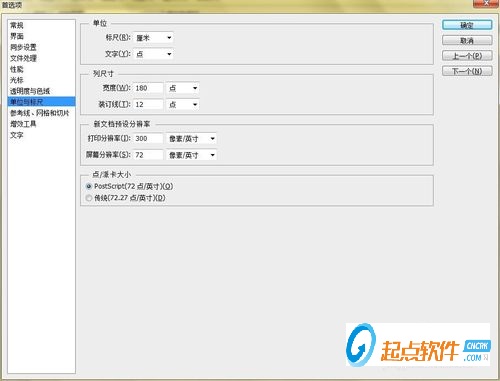 6.切換到【單位與標(biāo)尺】選項(xiàng)卡,可以設(shè)置【單位】|【列尺寸】|【新文檔預(yù)設(shè)分辨率】|【點(diǎn)/派卡大小】。