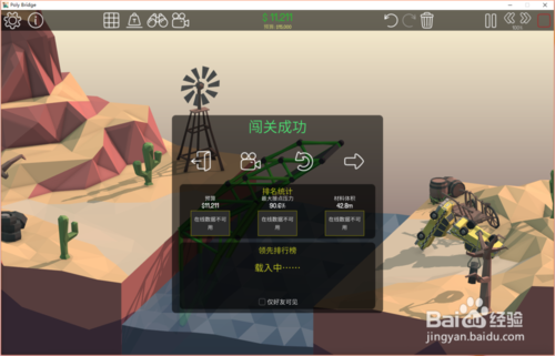 8、點(diǎn)擊開(kāi)始模擬按鈕,測(cè)試通過(guò)結(jié)果如下:預(yù)算9329;壓力25.7%;材料體積37.8(可以看到這次車(chē)輛順利通過(guò),橋梁也沒(méi)有損毀,而且三項(xiàng)數(shù)值都是非常理想的)