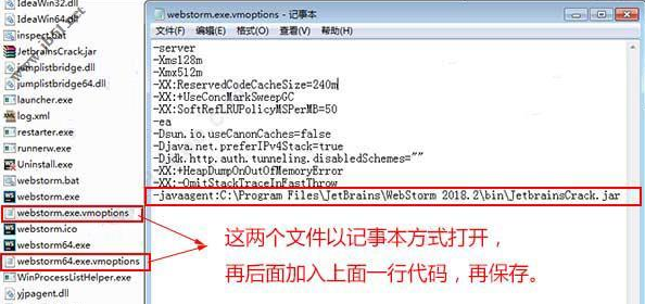 6、再用記事本打開“webstorm.exe.vmoptions”和“webstorm64.exee.vmoptions”這兩個(gè)文件,再后面添加破解文件的路徑,就是中括號中的內(nèi)容【-javaagent:C:\Program Files\JetBrains\WebStorm 2018.2\bin\JetbrainsCrack.jar】