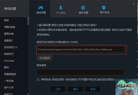 3、在游戲設(shè)置中進(jìn)行游戲啟動(dòng)項(xiàng)的設(shè)置,如圖,將steam里的星露谷文件夾里Stardew Valley.exe調(diào)出來(lái)即可