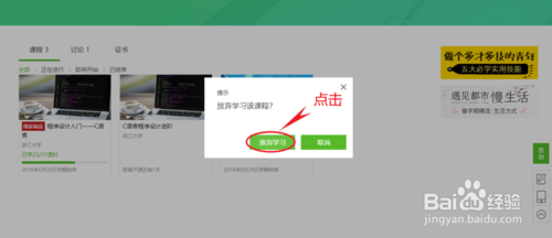 點擊“退選課程”。在彈出的框中,點擊“放棄學習”,你的課程就退選成功了。