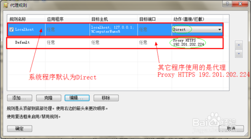 如圖所示,第一行的為系統(tǒng)程序(但不包含IE等)的規(guī)則:Direct(直接連接,不通過代理)。第二行為其他應(yīng)用程序,通過代理進(jìn)行連接。