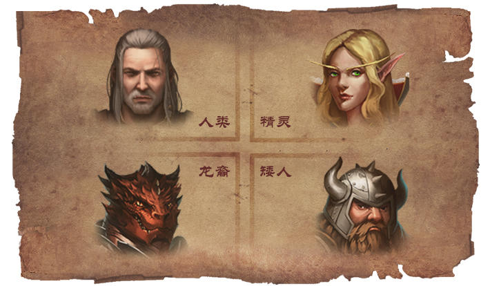 角色培養(yǎng)種族包含了人類、精靈、龍裔、矮人,職業(yè)有戰(zhàn)士、牧師、法師、游俠和軍閥。