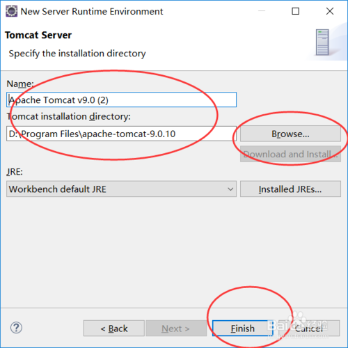 下圖是說明TOMCAT的配置方法,也是只有兩步,方法與JDK的方法是一樣的。找到D盤的路徑,然后是名字的設(shè)置,都是不能錯的。保存自己的配置,TOMCAT就完成了配置。