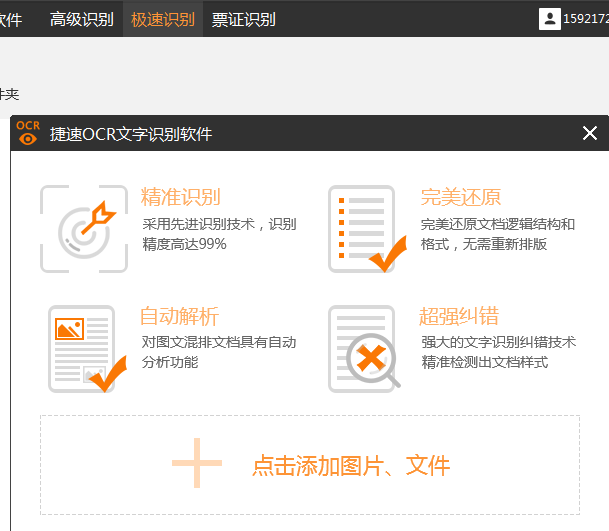 第二步,運行捷速OCR文字識別軟件,軟件默認(rèn)是極速識別模式,可以自己換識別模式,然后把要識別的圖片文件添加進(jìn)來。