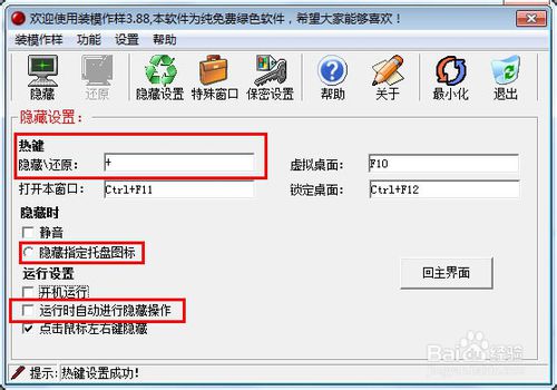 隱藏設(shè)置里設(shè)置一下隱藏熱鍵和呼出熱鍵,包括靜音,運行時自動隱藏等選項,下面的隱藏制定托盤圖標選擇需要隱藏的