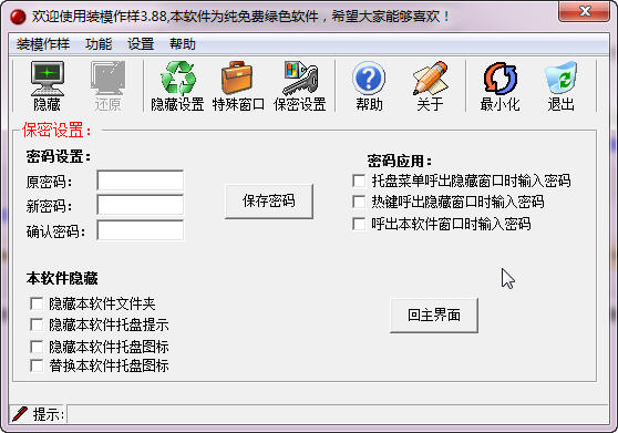 裝模作樣軟件是一款窗口隱藏工具,正在上網(wǎng)聊天玩游戲,老板進來了?正在瀏覽“隱私”文件,突然一位不速之客來找你?只需同時按下鼠標左右鍵(或F9鍵)就可以瞬間隱藏所有的隱私窗口,而只保留(或調(diào)出)你設(shè)定好的軟件(文件)。再次按下F9鍵,窗口就會原樣恢復(fù),工作狀態(tài)與游戲狀態(tài)瞬間轉(zhuǎn)化。軟件功能強大,在隱藏時可以選擇靜音,隱藏托盤圖標等功能,自由設(shè)定公開窗口,此外還可以隱藏程序自身及托盤圖標以防止別人發(fā)現(xiàn)自己安裝了本軟件。