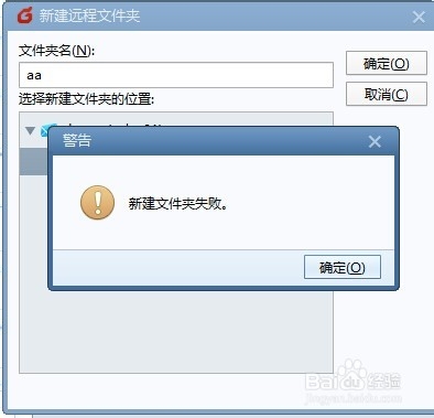 輸入文件名,點(diǎn)擊確認(rèn)。你會(huì)發(fā)現(xiàn)出現(xiàn)了一個(gè)端口,提示“新建文件夾”失敗。這是為什么呢?請(qǐng)注意看窗口的頂部,上面顯示的“建立遠(yuǎn)程文件夾”,但是我們要建立的應(yīng)該是“本地文件夾”才對(duì)。問(wèn)題出現(xiàn)在哪里呢?