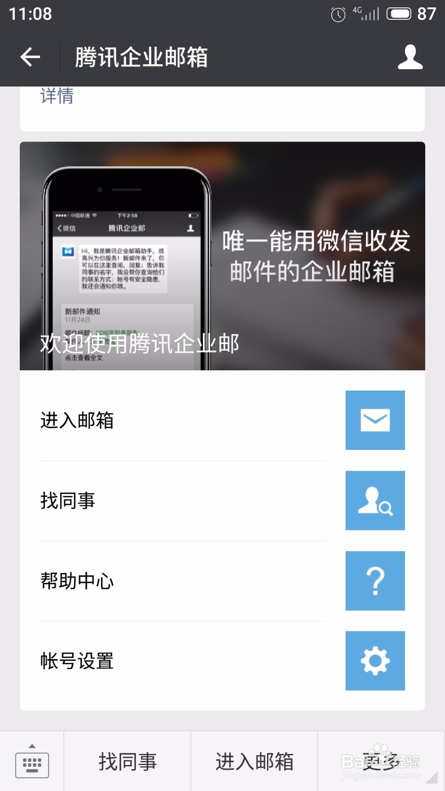 接下來(lái)就可以在手機(jī)微信上方便地使用騰訊企業(yè)郵箱Foxmail了。所有郵件與電腦上的完全同步,互不影響?!斑M(jìn)入郵箱”可以查看“收件箱”里面的郵件,打開“我的郵箱”可以進(jìn)行“寫郵件”等操作。