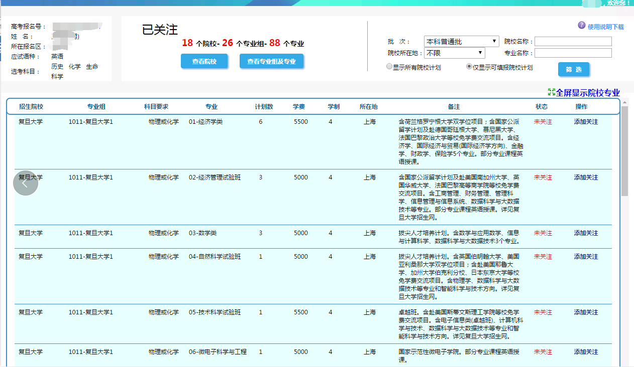 在主界面中點(diǎn)擊“查看已關(guān)注院校專業(yè)”按鈕,可查看所有已關(guān)注的院校專業(yè)