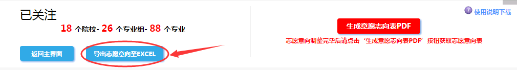 考生如需將關(guān)注的院校專業(yè)導(dǎo)出或打印出來,可以點(diǎn)擊“導(dǎo)出志愿意向至EXCEL”進(jìn)行導(dǎo)出操作。