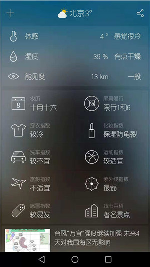 3、操作方便:上下滑動的操作方式,可更快速更便捷的查看天氣趨勢、風速、生活指數(shù)等信息。