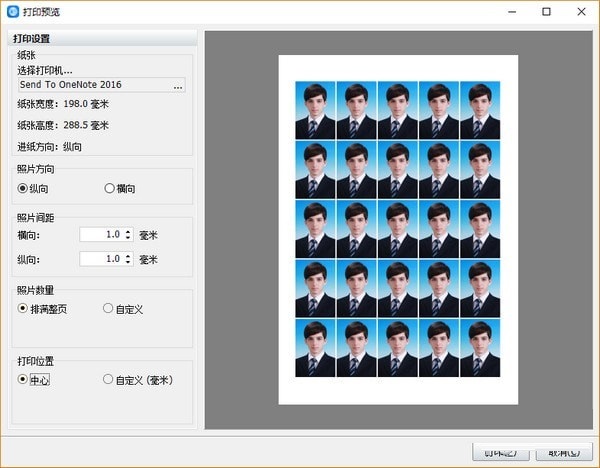 此時(shí)可選擇打印機(jī)設(shè)備,查看紙張信息,選擇照片方向,設(shè)置照片間距,自定義照片數(shù)量和自定義打印位置等。
