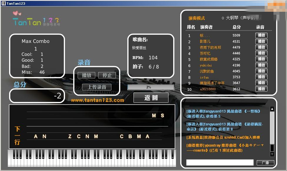 注意:如果要記錄得分和排行,需要演奏前在網(wǎng)站首頁登錄。登錄之后新打開的曲譜,在網(wǎng)頁和客戶端中演奏都可以記錄得分、挑戰(zhàn)排行了。
