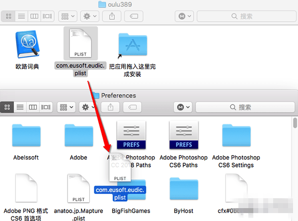 2、把左側(cè)下載好的資源包,解壓后的文件夾中的的“com.eusoft.eudic.plist”拖放入Preferences文件夾中。