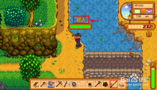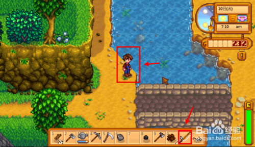 1、找到水源,然后在物品欄選中釣鉤,面朝水源站立。