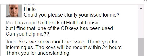然后用英語(yǔ)輸入你的問(wèn)題就可以了,這里我說(shuō)的是我這里一個(gè)六人包里的CDKEY有一個(gè)已經(jīng)被使用了,客服說(shuō)24h內(nèi)給我重發(fā)一個(gè)。