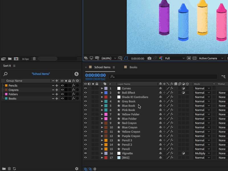 Sort it腳本是最終的工作流程工具,將C4D 中令人驚嘆強(qiáng)大的層管理器概念帶入到AE軟件中!腳本允許您通過單擊按鈕或簡(jiǎn)單快捷鍵(CMD / CTRL + G)對(duì)任何組合中的圖層進(jìn)行分組,以便您可以使用圖層組來組織,輕松選擇和控制多個(gè)圖層。只需在Sort It Group Manager中選擇一個(gè)組,它就會(huì)自動(dòng)選擇分配給該組的那些圖層??煽焖偾袚Q圖層組可見性,效果,圖層鎖定和圖層單獨(dú)顯示等,以實(shí)現(xiàn)絕對(duì)控制!通過使用ShySolo功能,整理您的時(shí)間軸或補(bǔ)償窗口,以專注于單個(gè)圖層或圖層組!使用Sort It,你終于可以控制你日復(fù)一日的雜亂的After Effects時(shí)間線了!由于能夠不僅在時(shí)間軸中切換圖層組可見性,而且還可以在您的Comp Window中切換,您將更快,更高效地工作,并且工作區(qū)中的雜亂性更??!只需單擊按鈕即可聚焦并隔離您想要的圖層,并在AE工作區(qū)中有一些空間進(jìn)行操作!