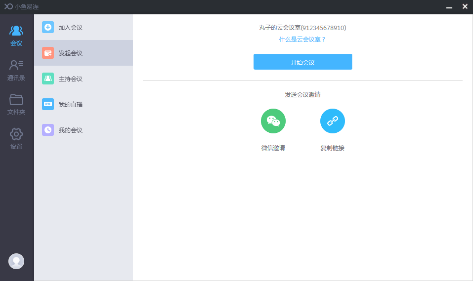 用戶可通過PC客戶端發(fā)起自己的會議,點(diǎn)擊“發(fā)起會議”,右側(cè)頁面將顯示用戶的云會議號碼,點(diǎn)擊“開始會議”,即進(jìn)入云會議室開始視頻會議。