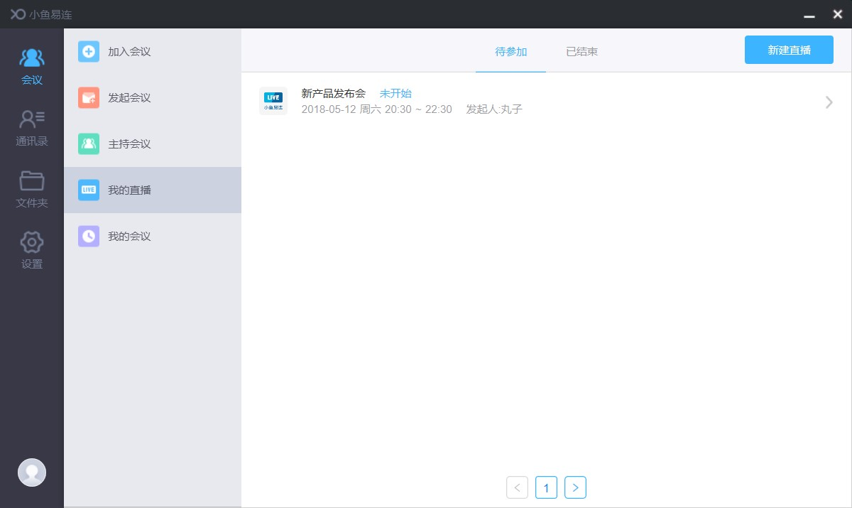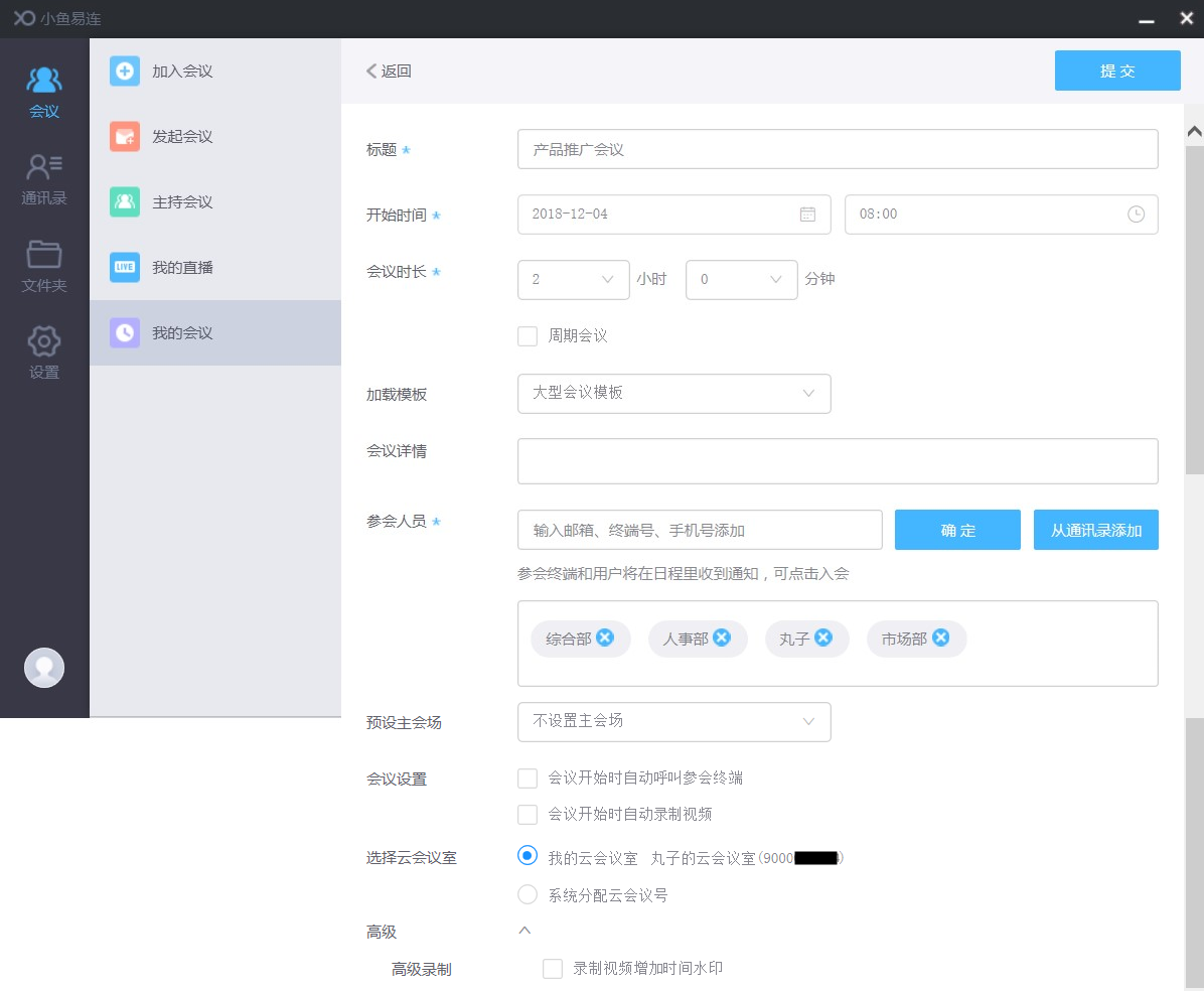 點(diǎn)擊“會議”-“我的直播”,右側(cè)界面顯示與用戶相關(guān)的直播列表。點(diǎn)擊右上角“新建直播”按鈕,用戶可以新建一個(gè)直播。填寫直播時(shí)間、標(biāo)題等信息,點(diǎn)擊“提交”按鈕,即可完成 。