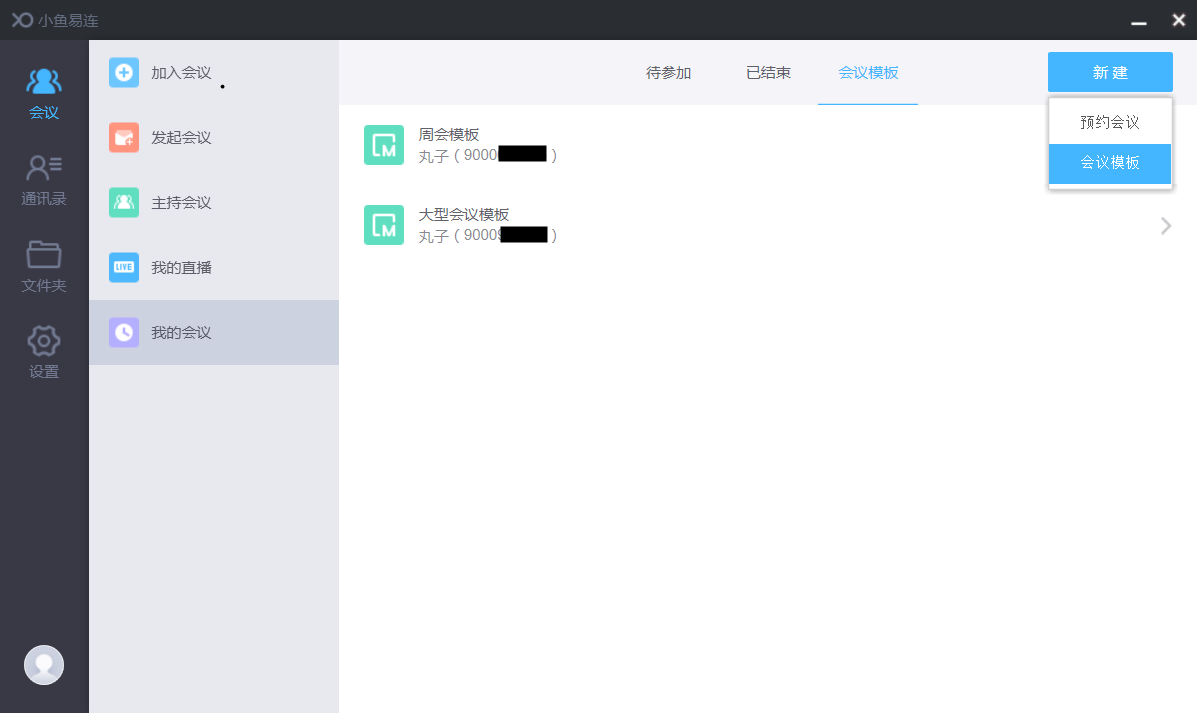 7、客戶端預(yù)約會議入口增加了會議模板的功能;通過新建會議模板保存會議模板,便于預(yù)約會議時(shí)直接調(diào)用會議模板。對于本用戶創(chuàng)建的全部會議模板將以列表方式在該頁簽下顯示。會議模板沒有會議開始時(shí)間、會議時(shí)長、周期相關(guān)的屬性,其他的屬性和預(yù)約會議屬性相同。