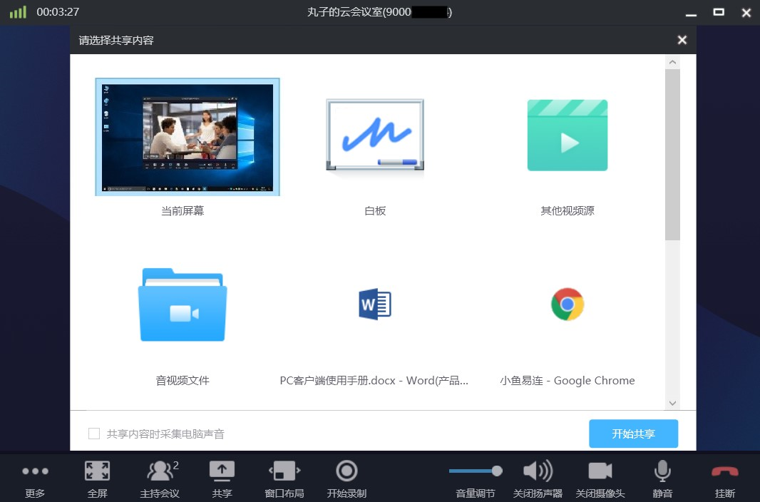 2、PC客戶端加入某個(gè)會議,在視頻通話過程中,點(diǎn)擊工具欄按鈕進(jìn)行共享內(nèi)容。主要用于用戶本地沒有其他小魚設(shè)備或客戶端,只可通過PC客戶端加入視頻會議,并同時(shí)共享內(nèi)容。