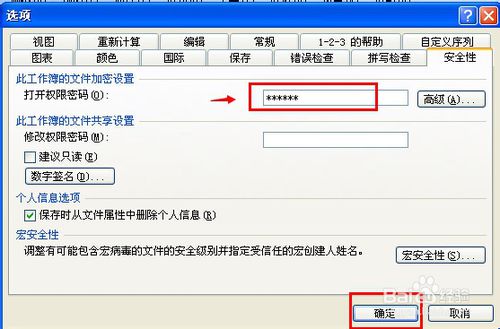 來到excel表格的加密設(shè)置,在打開權(quán)限密碼右側(cè)的輸入框中輸入提前想好的密碼,然后點擊確定。(如下圖)