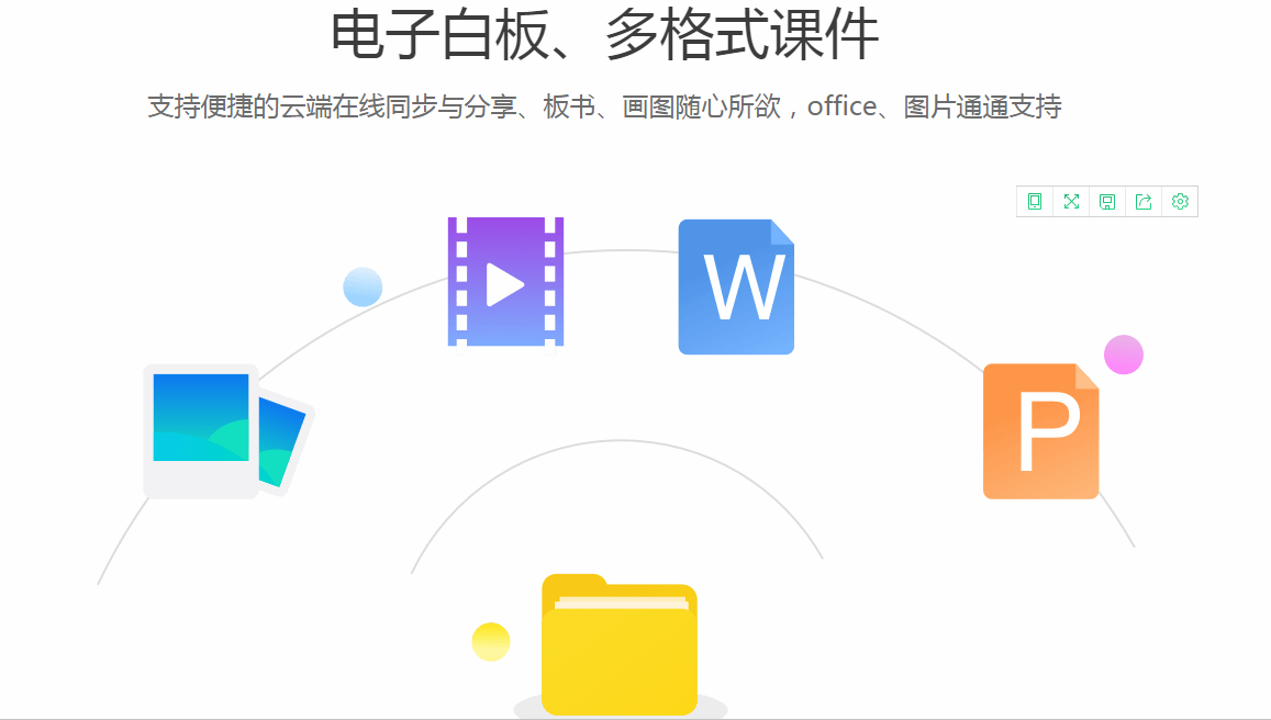 電子白板、多格式課件支持便捷的云端在線同步與分享、板書(shū)、畫(huà)圖隨心所欲,office、圖片通通支持