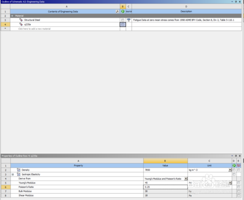 接著在工程A中雙擊工程數(shù)據(jù),Engineering Data,進(jìn)去后可看到系統(tǒng)默認(rèn)的材料屬性為結(jié)構(gòu)鋼。