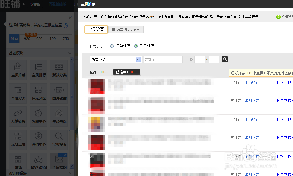 在左側選擇【寶貝設置】,對熱銷寶貝進行推薦,在推薦的右邊對寶貝逐一排序,一般原則是熱銷靠前,冷門寶貝靠后。