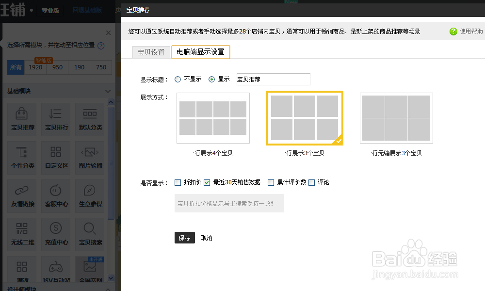 打開后可以看到寶貝在電腦端的顯示設置,根據(jù)消費者喜好和寶貝的數(shù)量選擇展示方式和展示內容。