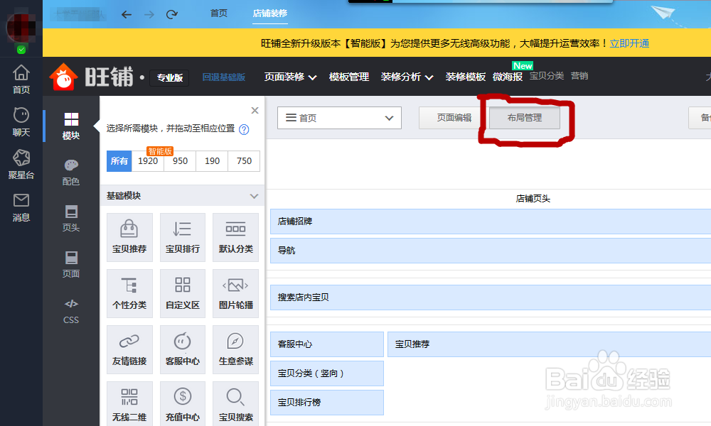 選擇如圖所示的【布局管理】,根據(jù)自己的偏好和消費者的喜愛,將店鋪中多余的模塊去掉,可以適當加一些其他模塊(模塊可以重復添加)。