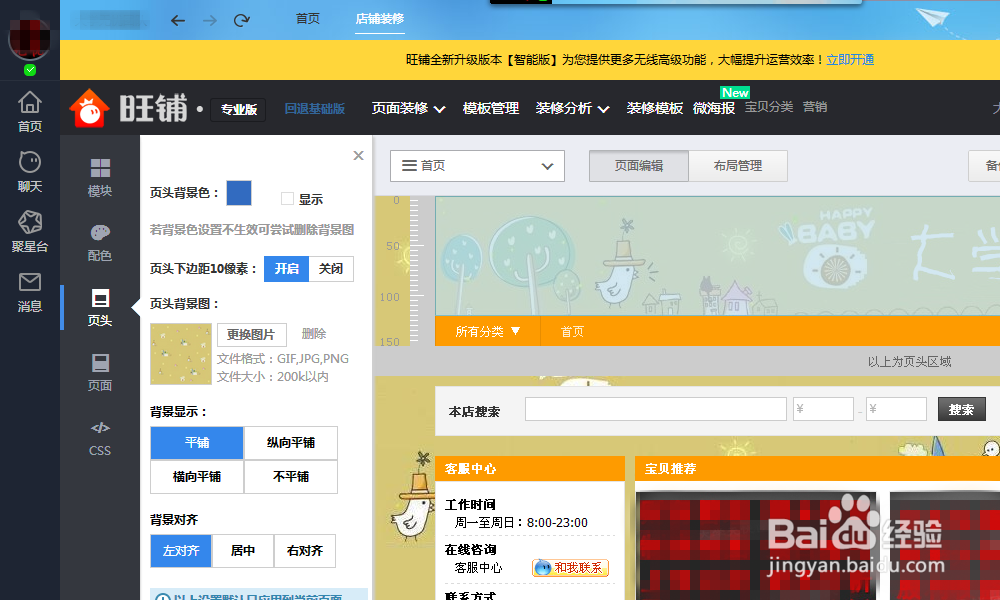 在頁面中選擇【頁面編輯】界面。在左側頁頭部分選擇頁頭背景色,插入已經做好的頁頭背景圖,進行保存。