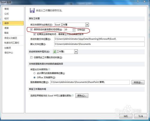 5、設(shè)置“保存自動恢復(fù)信息時間間隔”前的復(fù)選框打?qū)μ枺⒃O(shè)定時間,默認(rèn)為10分鐘。