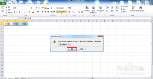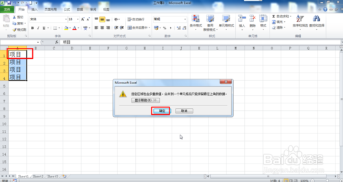 11、合并單元格時,只能保留第一個小單元格的數(shù)據(jù),在彈出的對話框中,點擊確定按鈕,如圖所示: